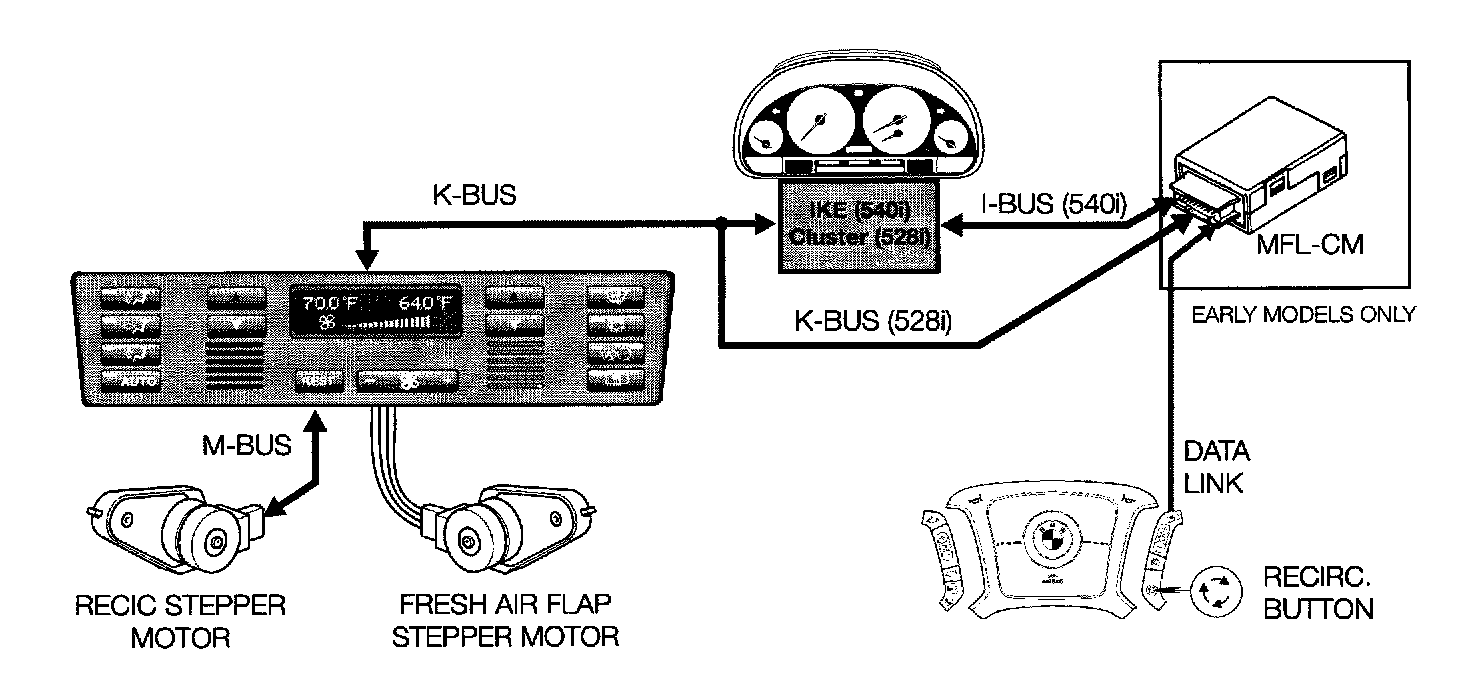The recirc button in the multi-function steering wheel communicates with IHKA over the I/K bus links. Pressing the button signals the IHKA to close the fresh air flap and open the recirc flaps or visa-versa.