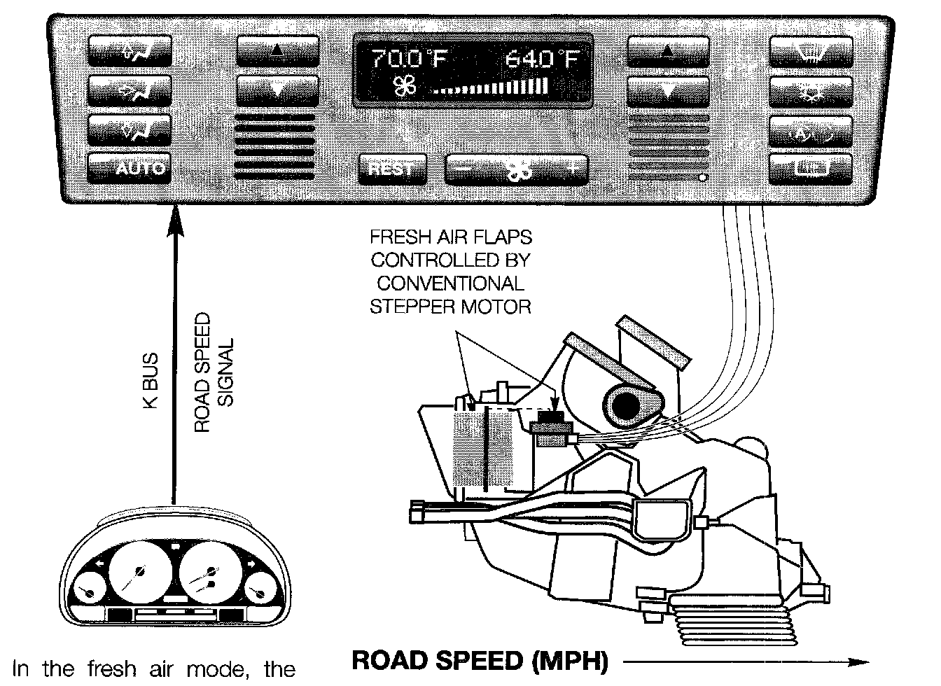 The air volume entering the IHKA system is compensated for at higher vehicle speeds. This is carried out through the road speed dependent fresh air flap operation.