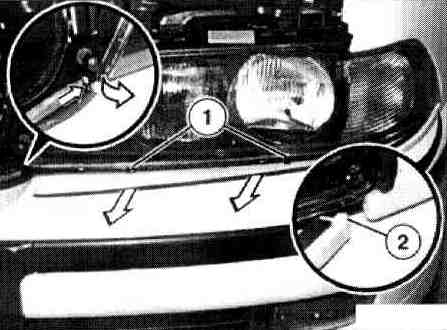 Unclip inside finisher, remove lower trim strip from brackets (1) and pull out hooks (2).