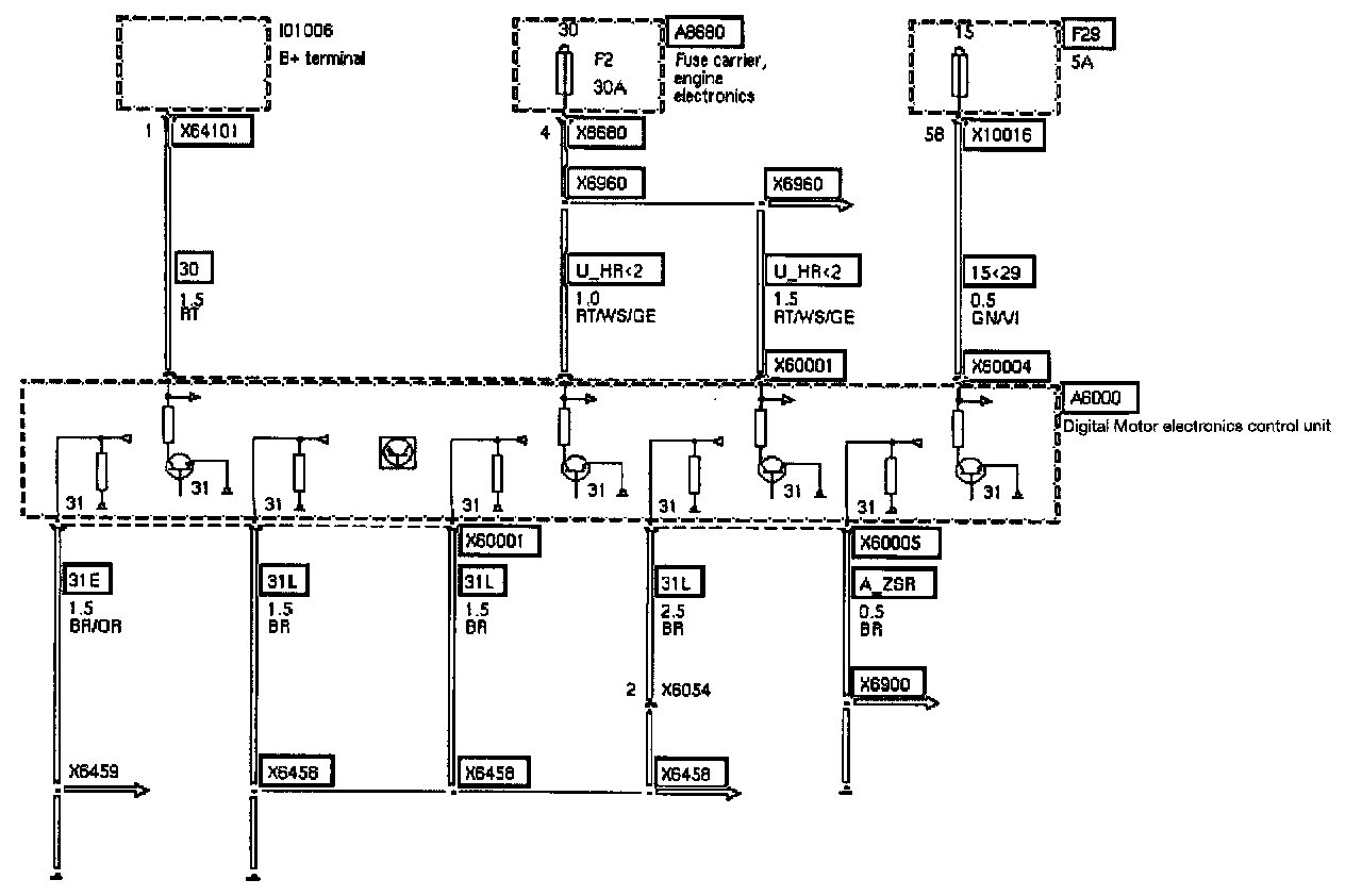 The MS42.0 Control Module receives power at 4 pins. One supply is direct from B+, the other two from the engine electronics fuse carrier, and the remaining from the main fuse location.
