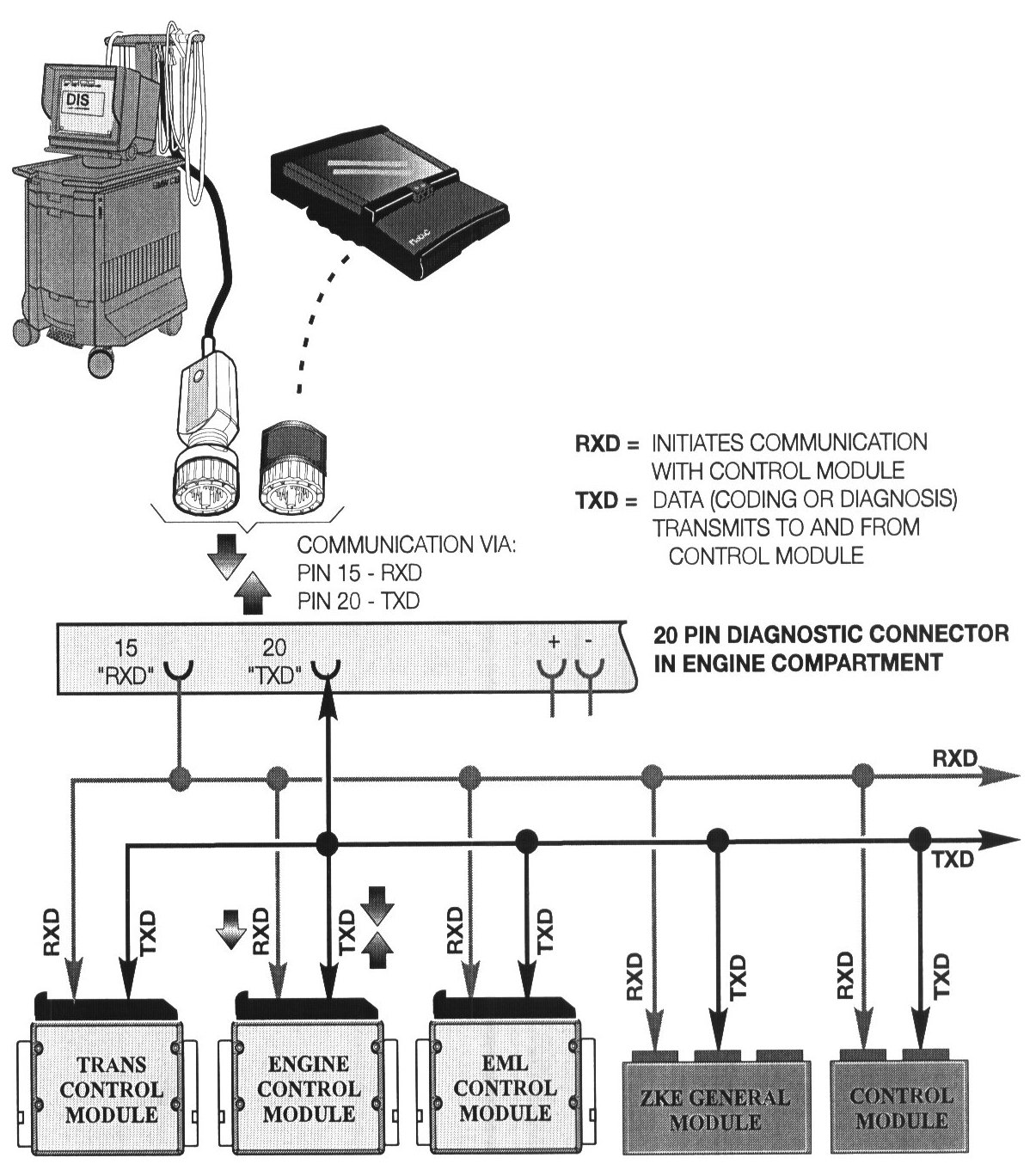 - RXD is a one way communication link from the DIS/MoDiC to the control module which initiates the start of communication.