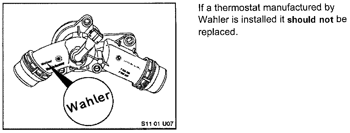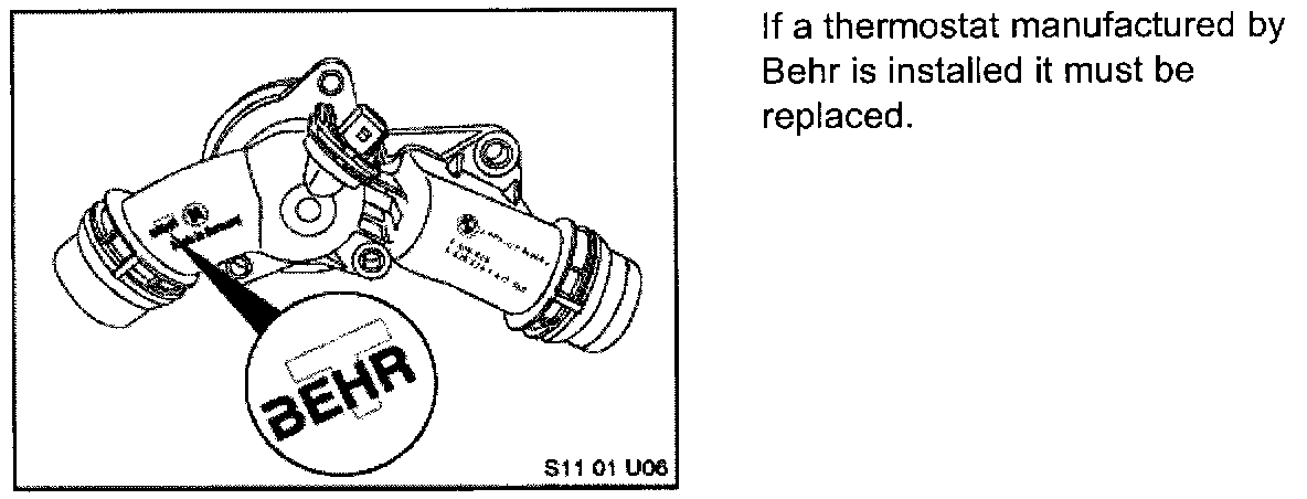 If a Behr thermostat is found as shown, it must be replaced as outlined in the appropriate repair manual group 11, section 11 53 000.