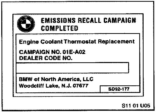 After the vehicle has been corrected, obtain a label (SD92-177) and with a ball point pen print your BMW center code (5 digits) on the Recall Completion Label (see illustration). An initial quantity of 100 labels will be sent to all BMW automotive centers. Peel the label from its backing and affix it to the left front strut tower (in the engine compartment) next to the Vehicle Emission Control Label.