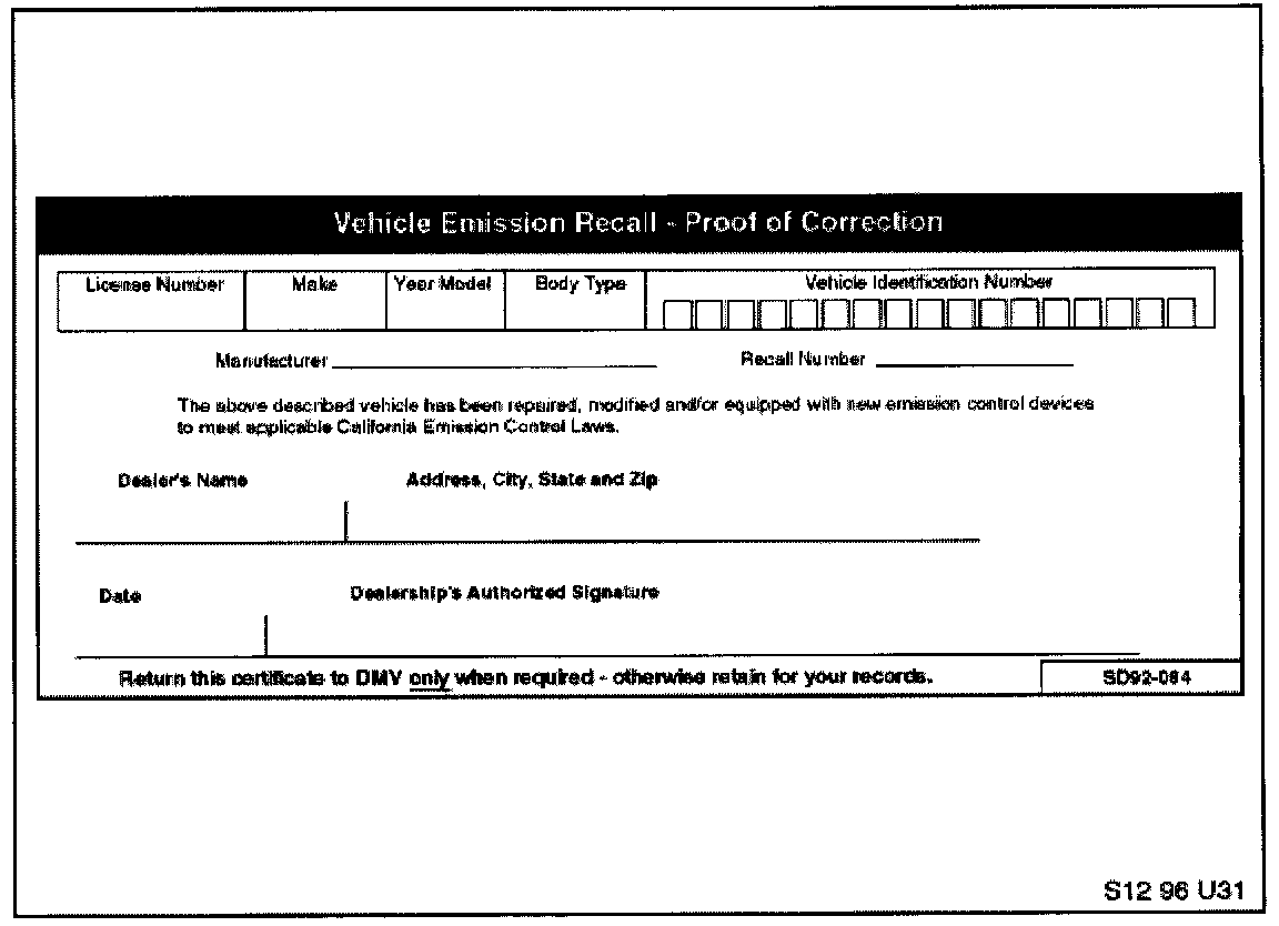 For California centers only it is required by the California Code of Regulations that an executed orange "Vehicle Emissions Recall - Proof of Correction" certificate (SD92-084, see illustration) be provided to each customer (for vehicles registered in the state of California) once the Recall on their vehicle has been completed.