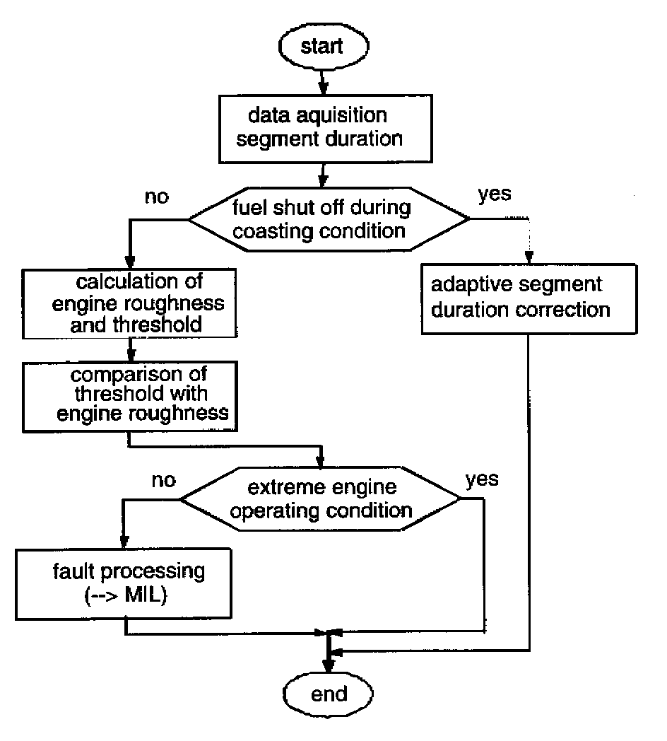 The engine roughness is derived from the differences from the segment periods (120° crank angle) durations which are corrected and compared to a load and engine-speed dependent thresholds. Different statistical methods are used to distinguish between normal changes of the segment duration and changes due to misfire.