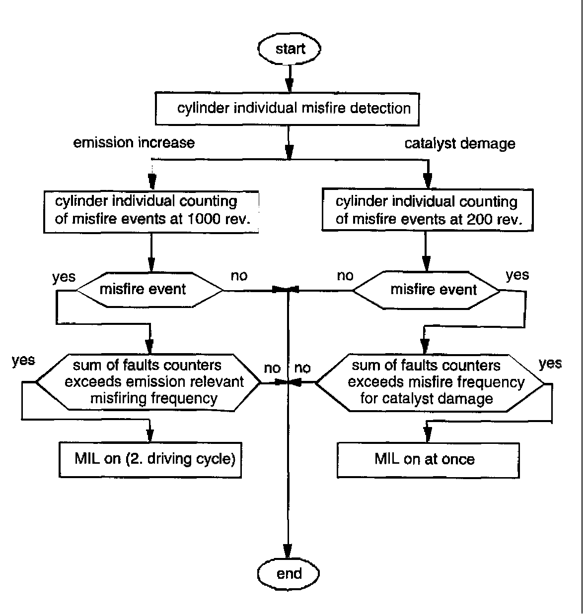 Within an interval of 200 crankshaft revolutions the detected number of misfiring events is weighted and calculated for each cylinder. The weighting factor is determined by a load/speed dependent map. If the sum of cylinder misfire incidents exceeds a predetermined value a fault code is stored and the MIL is illuminated at once. If the cylinder selective count exceeds the predetermined threshold the following measures take place;