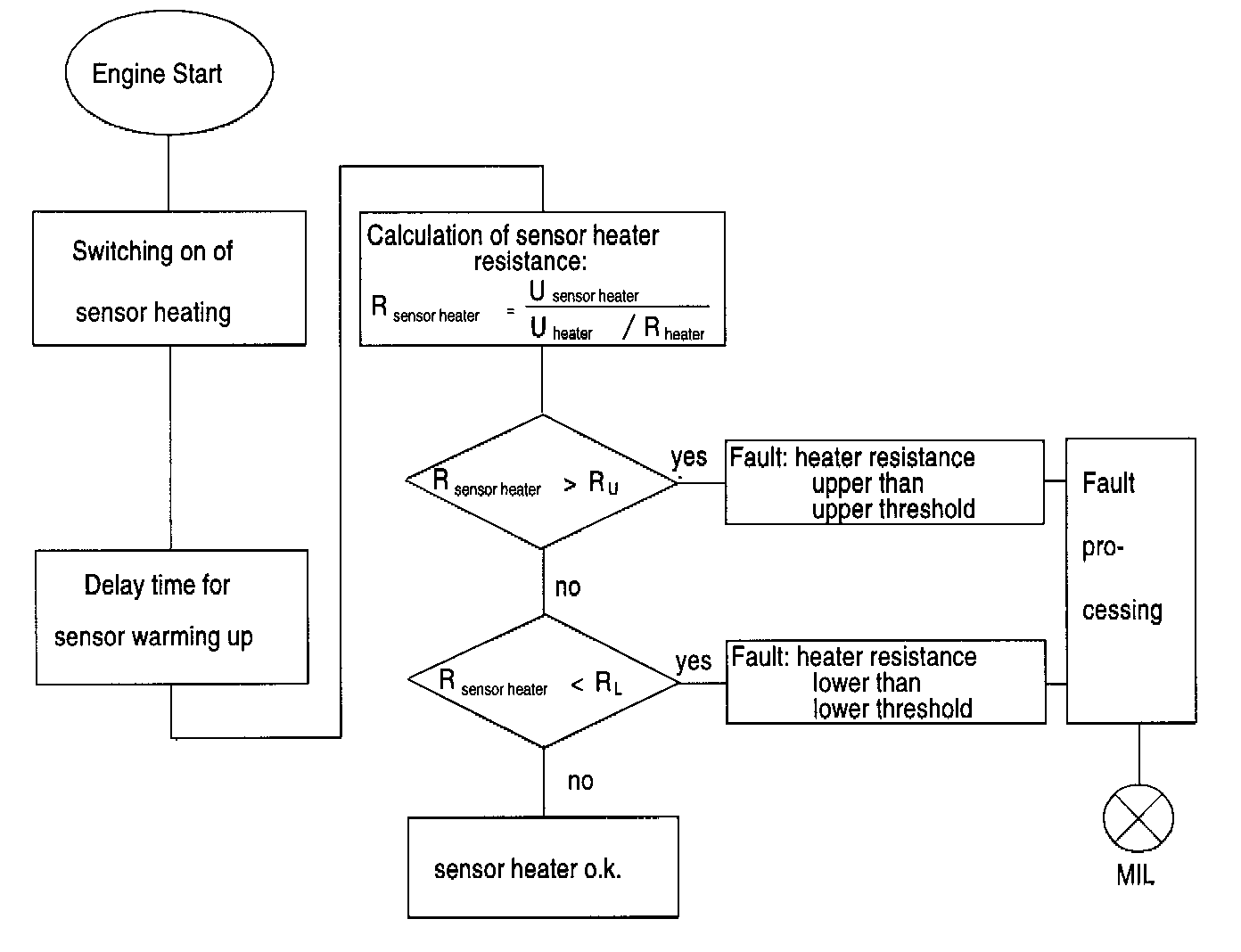 The monitoring function measures both, sensor heater current (voltage drop over a shunt) and the heater voltage (heater supply voltage) to calculate the sensor heater resistance.