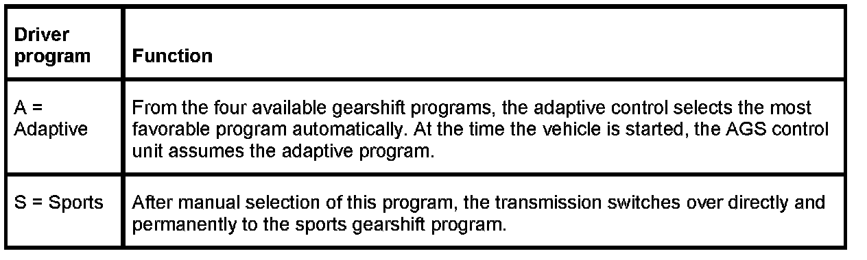 This button makes it possible for the driver to intervene in the driving program manually. Selection of the S-program (sports) leads directly and exclusively to the sports gearshift program. This program is not exited before the A-program (adaptive) is selected and the adaptive functions are activated once again. The A-program is always selected when the vehicle is started.