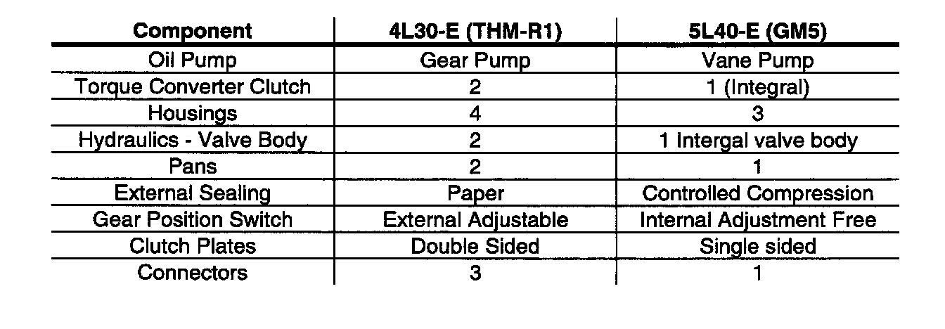The advantages/improvement of the 5L40-E. over the THM-R1 (4L30-E) are listed in the illustration.