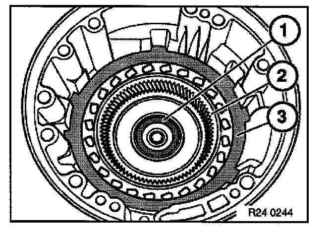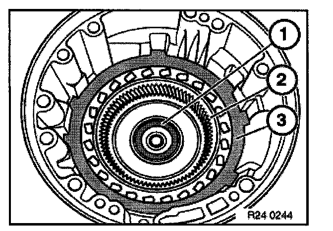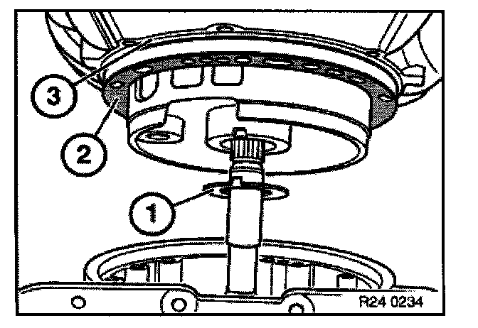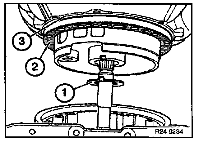 Remove axial needle bearing (1), ring gear (2) and steel disc (3).