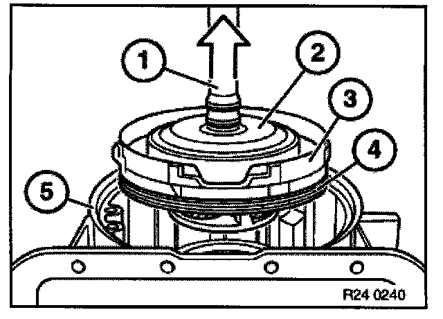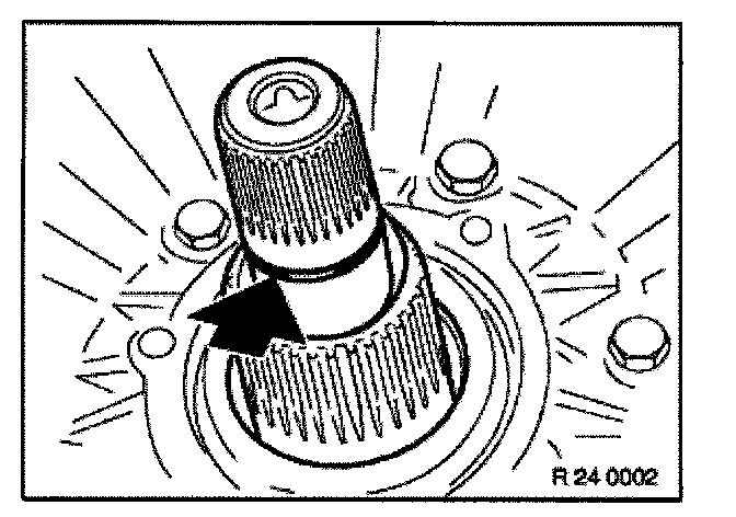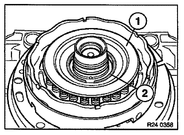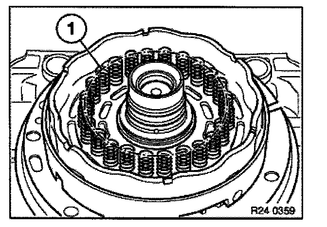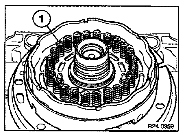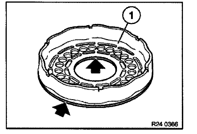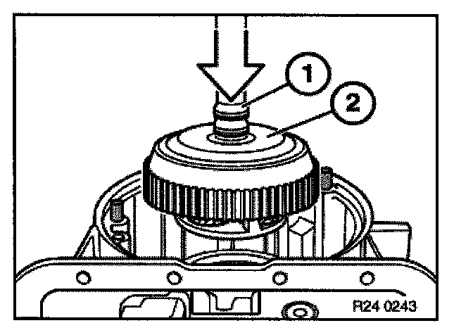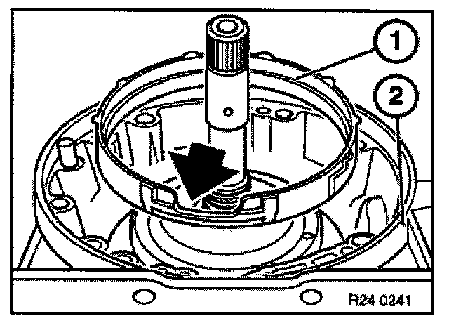 Press down spring retainer (1) with special tool 24 2 311/24 2 312 until strain is removed from snap ring (2).