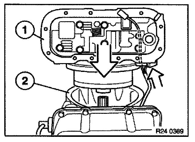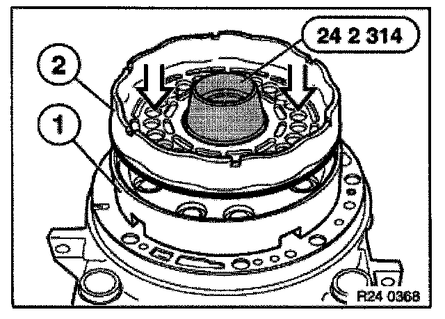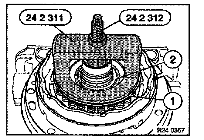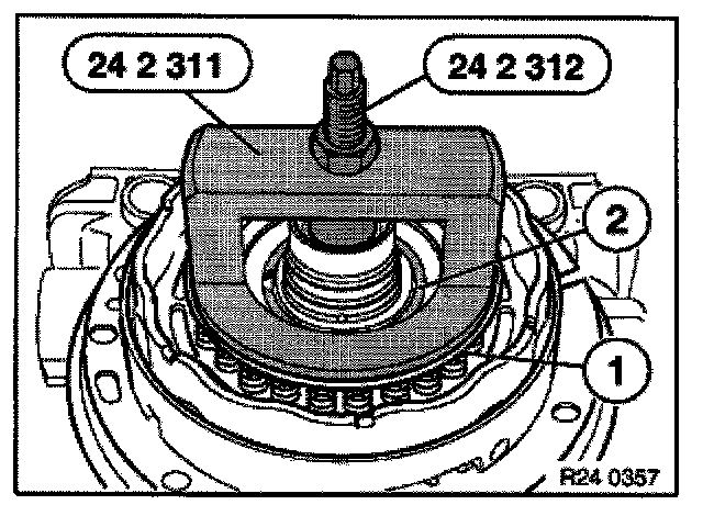 Press down spring retainer (1) with special tool 24 2 311/24 2 312 until groove for snap ring (2) is free.