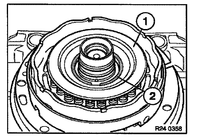 Manually push and turn the torque converter into the converter bell housing until the recess of the converter hub rests in the drive plate of the pump wheel and the torque converter perceptibly slides in.
