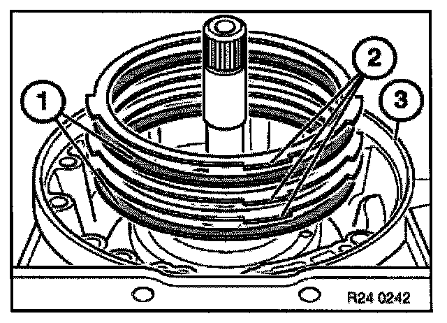 Install ring gear (2) and steel disc (3) in intermediate housing.
