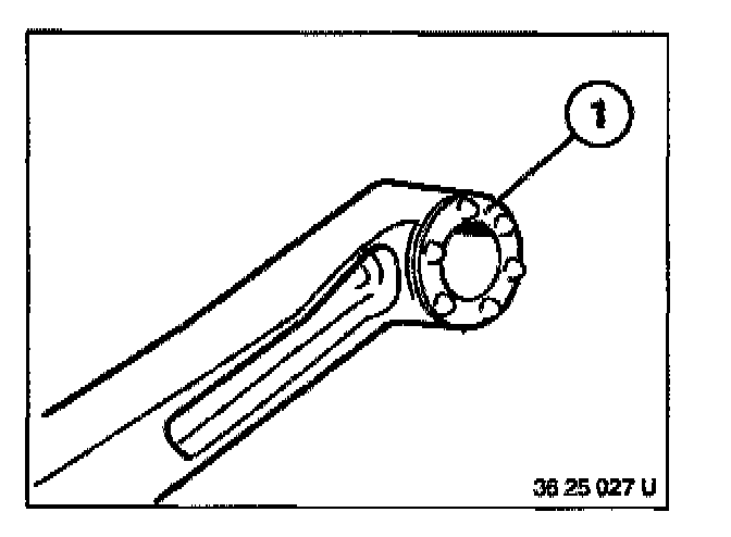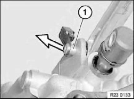 Lever out spring (1) with a screwdriver from lug (2) on housing. Tilt spring upwards.