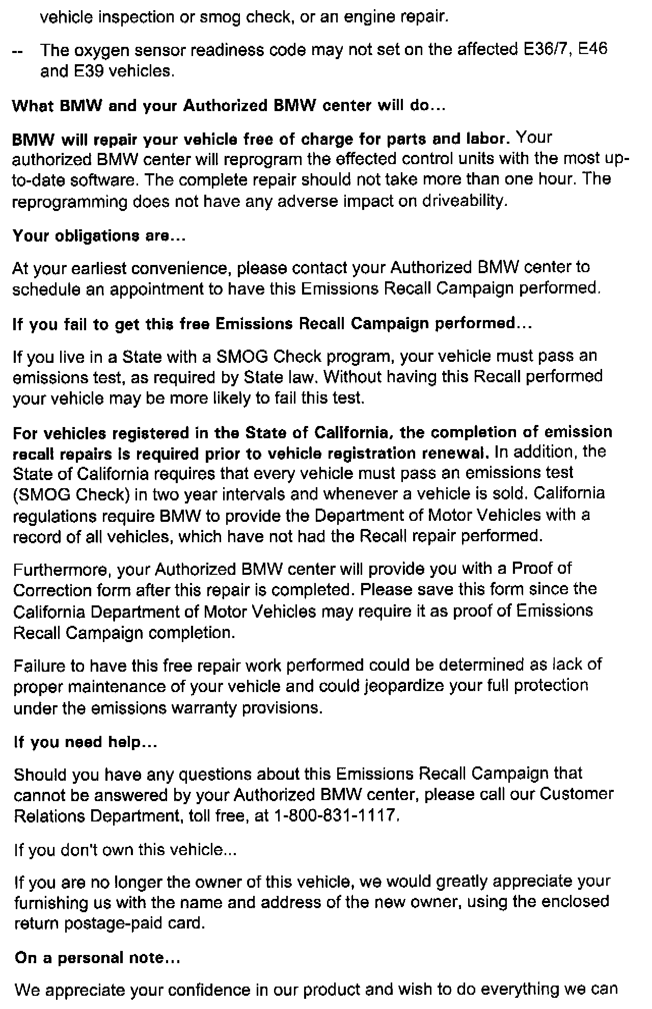 BMW has determined that certain 1999 & 2000 model year BMW automobiles with 2.5 liter and 2.8 liter displacement engines may not fully meet Federal Environmental Protection Agency (EPA) and California Air Resources Board on-board diagnostic requirements.