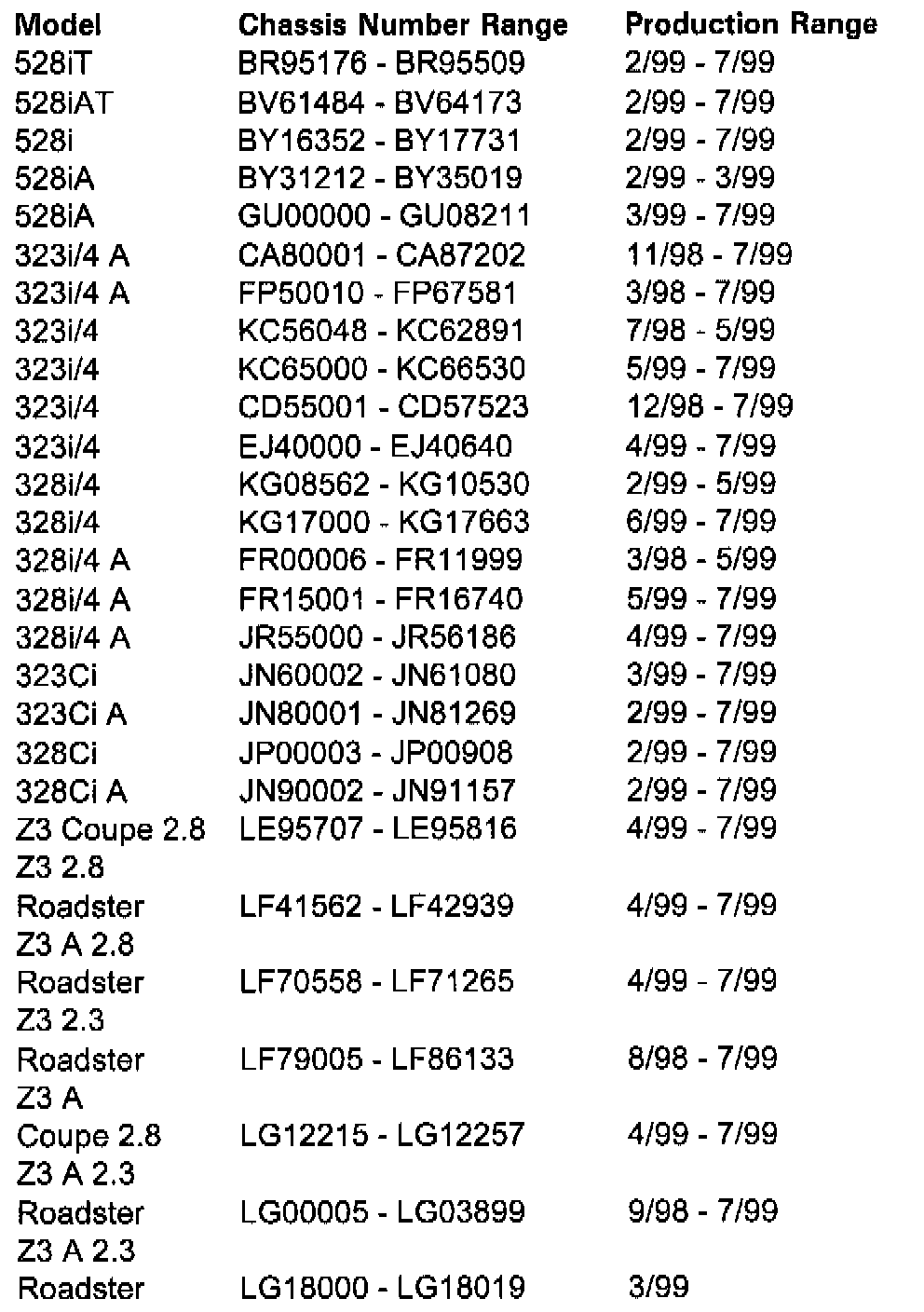 This recall involves E36 roadsters/coupes built between 9/98 7/99, E46 vehicles built between 3/98 - 7/99, and E39 vehicles built between 2/99 - 7/99.