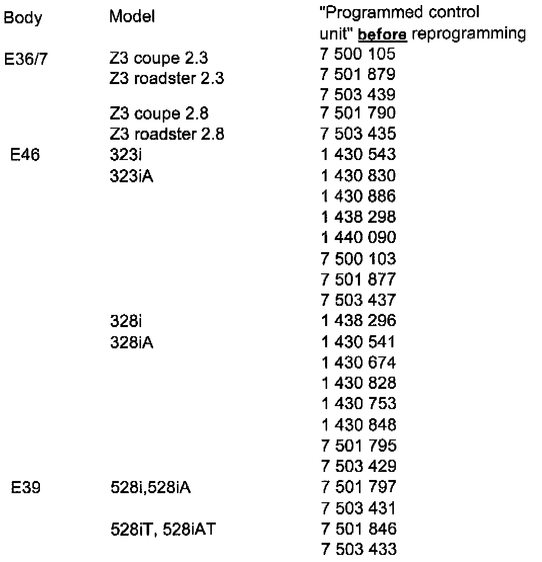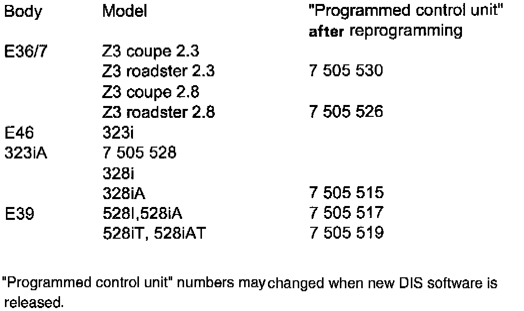 Vehicles produced up to 7/99 that have not been reprogrammed will have one of the following part numbers for a "Programmed control unit" displayed on the DME identification screen of the DIS/MoDiC. If one of these numbers is displayed, the control module MUST be reprogrammed, as shown.