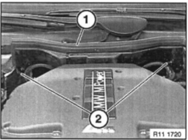 Unclip both cable strips (2), tilt up and tie back (e.g. to engine hood).
