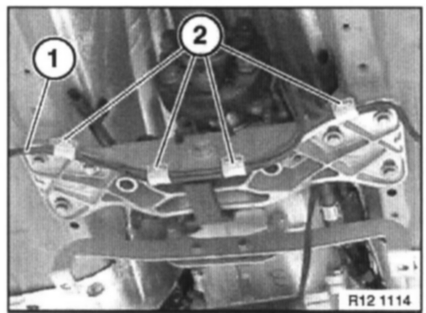 Unclip cable (1) from fixtures (2) on cross-member.