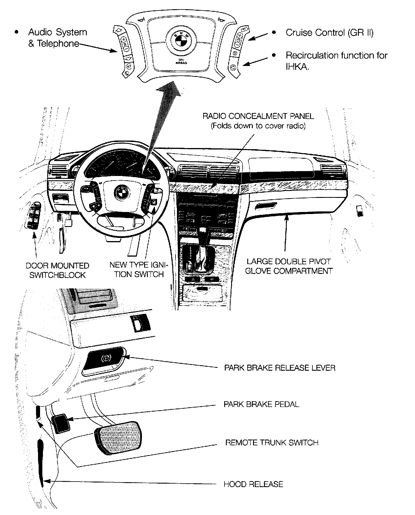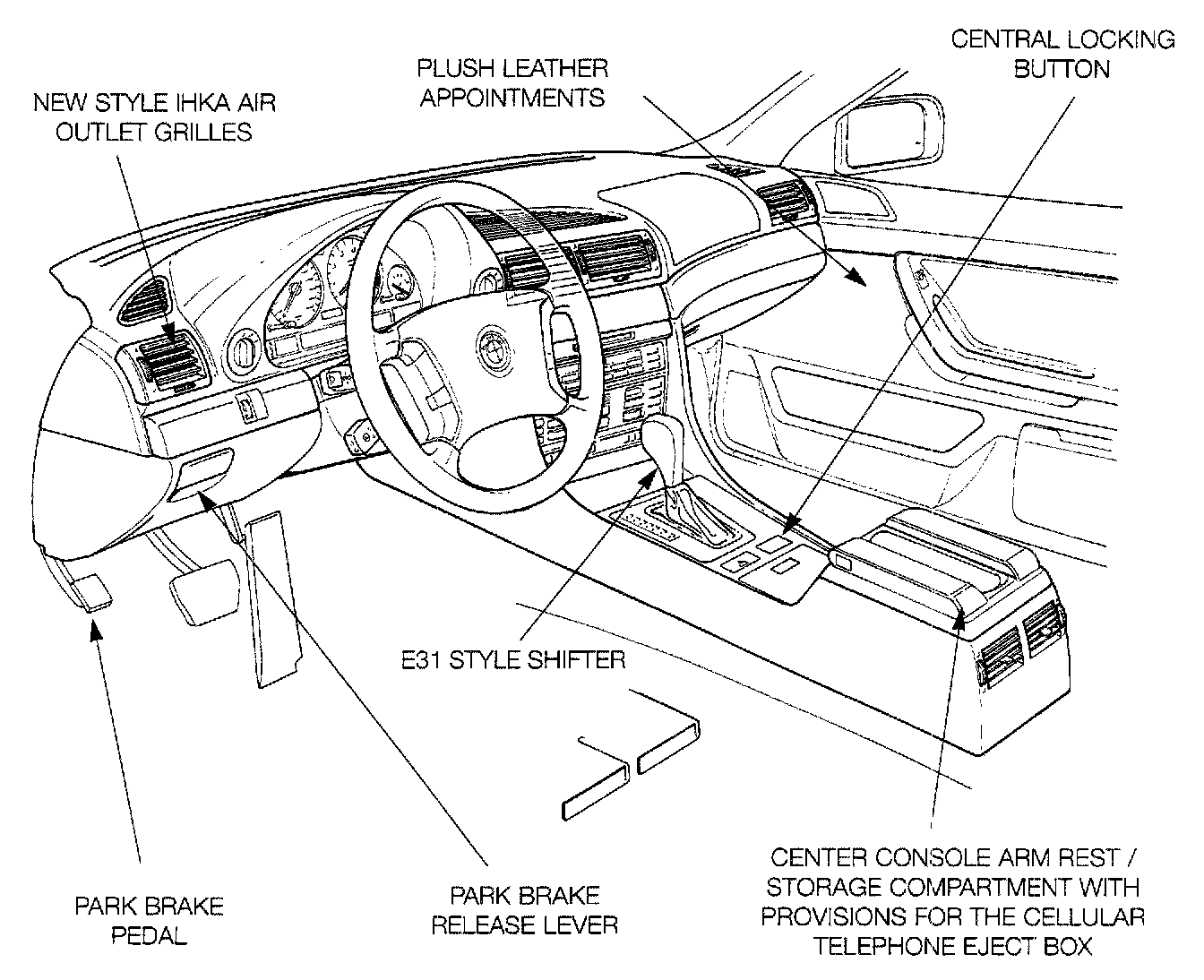 - New style driver/passenger armrest incorporated into the center console. The armrest can be easily converted to house the BMW cellular telephone. The position of phone makes it accessible to rear seat passengers as well.