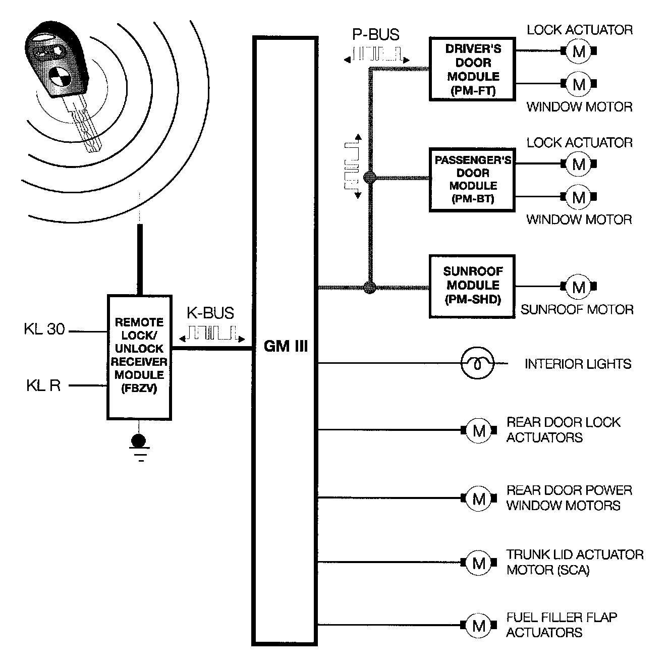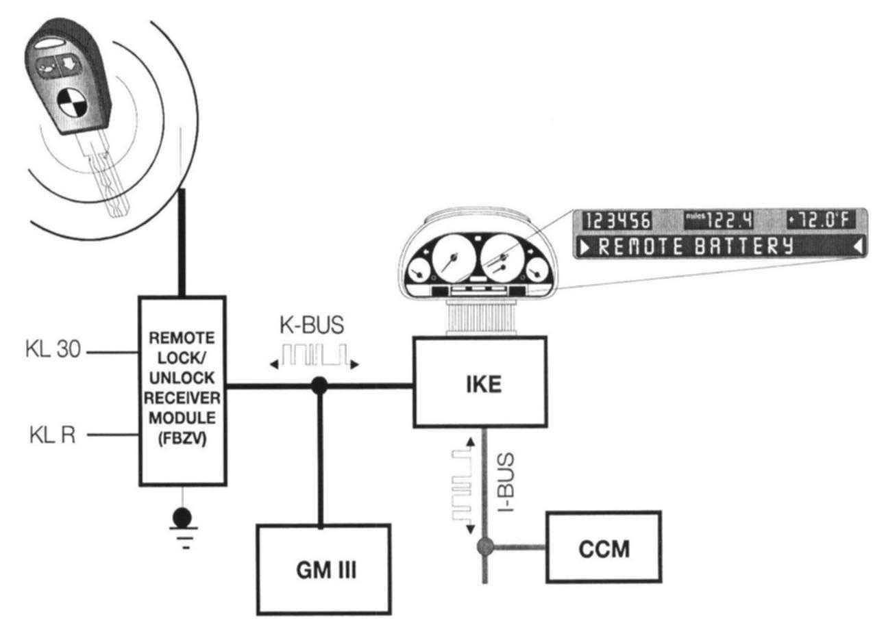 The remote entry control module (FBZV) is connected to the K-Bus. All commands from the transmitters are received by the control module and sent over the K-Bus to the GM III.