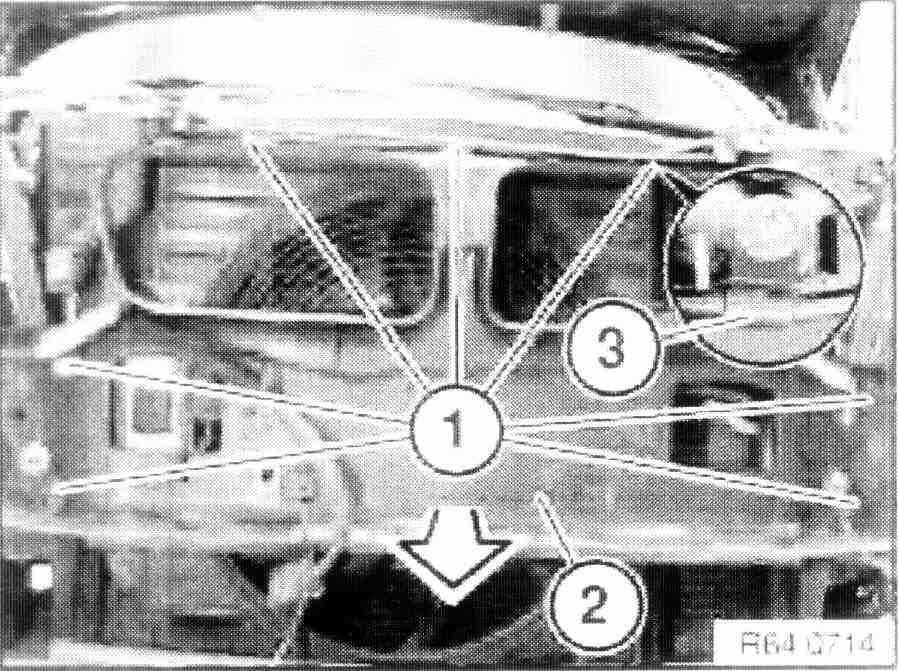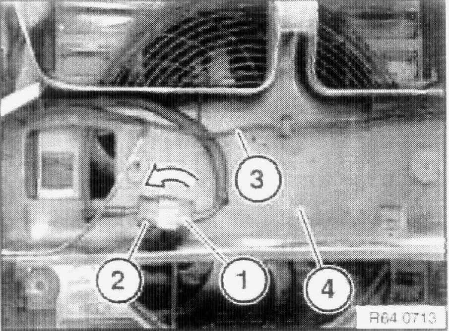 2. Disconnect plug connection ( 1 ). Turn plug ( 2 ) in direction of arrow and remove from air duct at front ( 4 ). Feed cable loom ( 3 ) out of fixtures.
