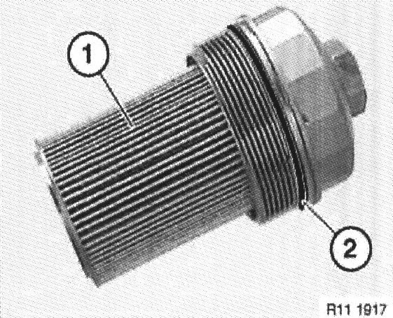 Detach oil filter element (1) from main flow oil filter cover and replace.