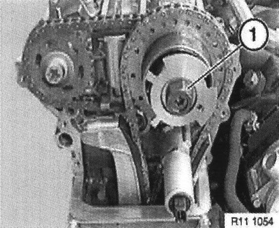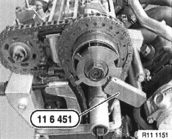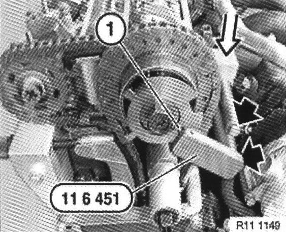 Align locating bore (1) on sensor gear of cylinder bank 1 to 4 to positioning pin on special tool 11 6 451. Fit special tool 11 6 451, insert screws and initially tighten without play. Press special tool 11 6 451 downwards and align to cylinder head. Tighten down special tool 11 6 451.