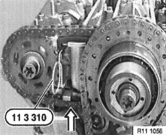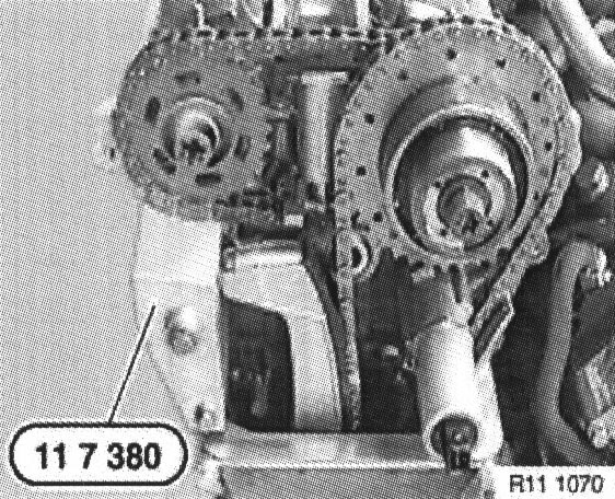 Compress chain tensioner on cylinder bank 1 to 4 and lock with special tool 11 3 310.