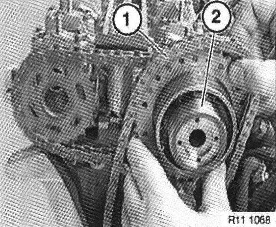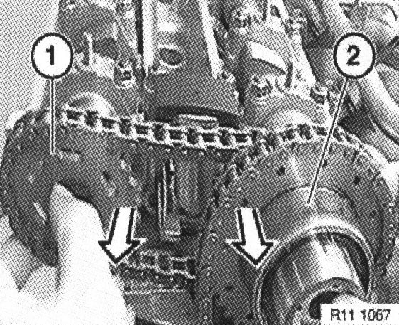 Note: The position of the elongated holes on the exhaust sprocket wheel is not assigned and can be freely selected. The position of the camshaft adjustment unit (2) when feeding on the timing chain (1) is not assigned and can be freely selected.