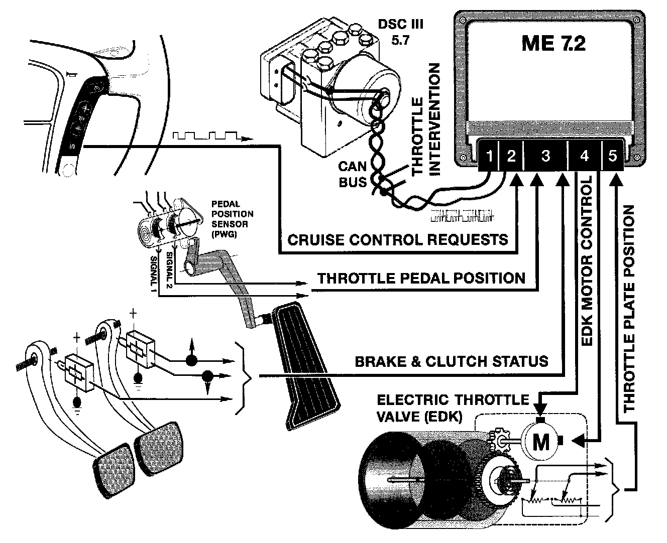 - If the monitored PWG potentiometer signals are not plausible, ME 7.2 will only use the lower of the two signals as the driver's pedal request input providing failsafe operation. Throttle response will be slower and maximum throttle position will be reduced.