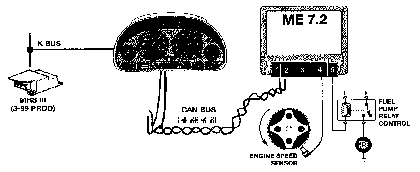 ME 7.2 controls the fuel pump relay as with previous systems with regard to engine speed input for continual activation of the relay.