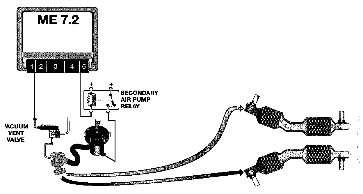 The DME ME7.2 control unit controls the vacuum vent valve and the secondary air injection pump relay separately but simultaneously.