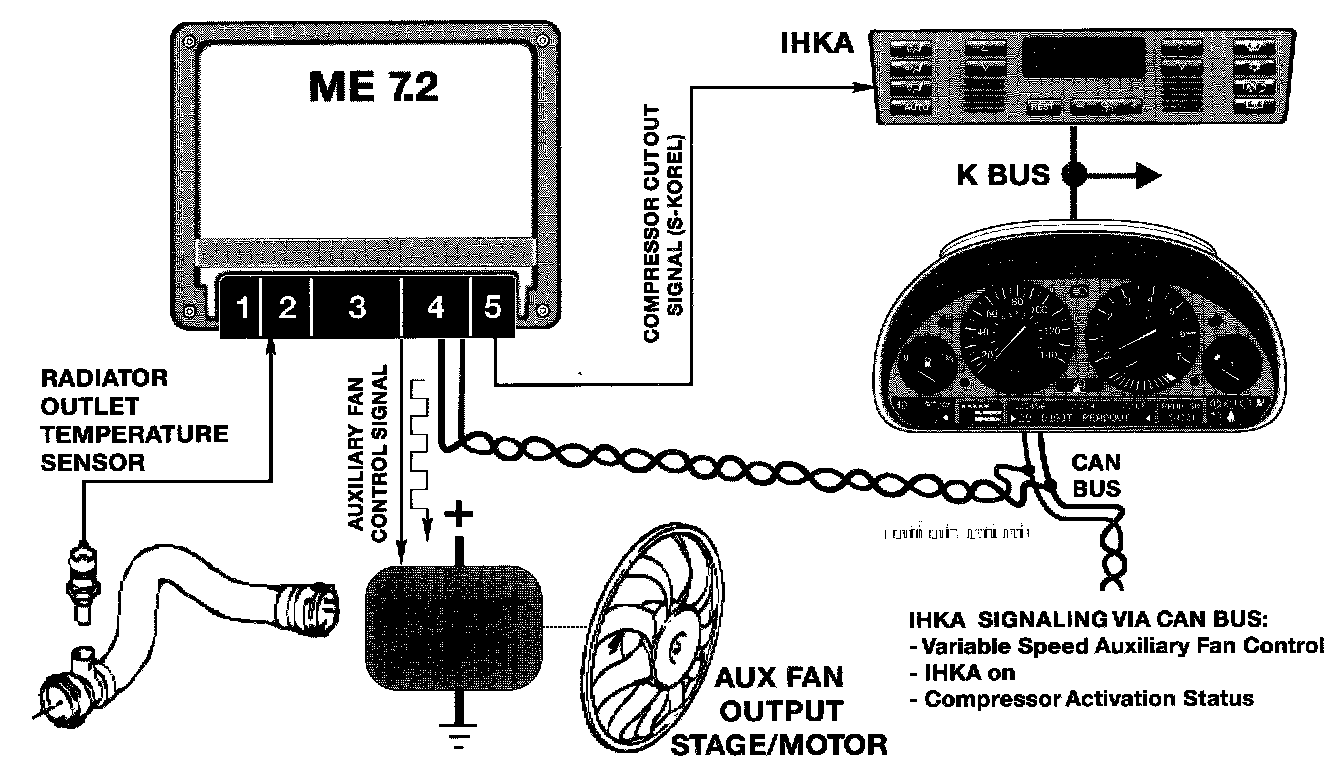 The auxiliary fan is controlled by ML 7.2. The motor output stage receives power and ground and activates the motor based on a PWM signal (10 - 100 Hz) received from the ME 7.2.