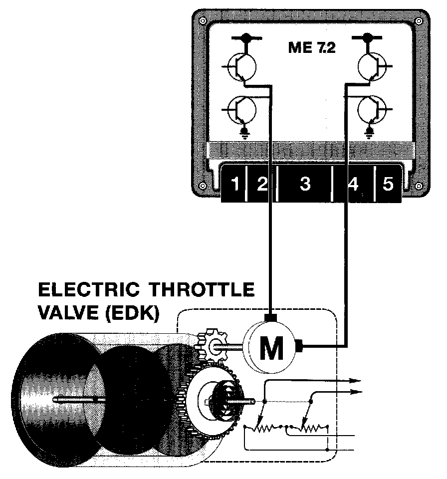 The throttle valve assembly of the M62 TU is an electric throttle valve (EDK) controlled by an integral EML function of the ME 7.2. The throttle plate is positioned by a gear reduction DC motor drive.