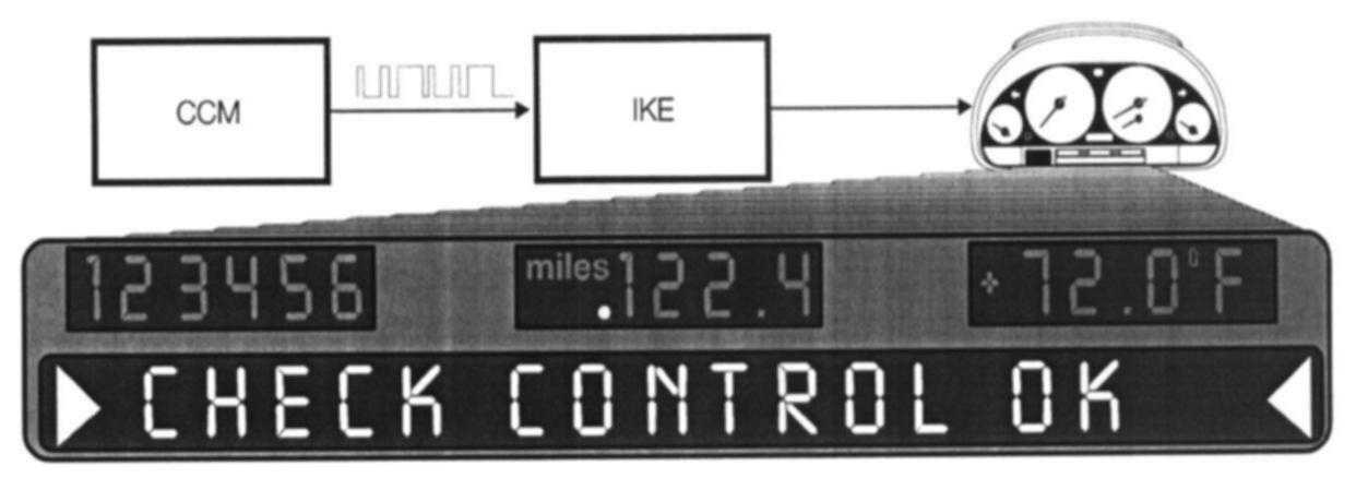 When the driver needs to be informed of a problem, the CCM signals the IKE over the I-BUS. The IKE will then post the message in the instrument cluster matrix display