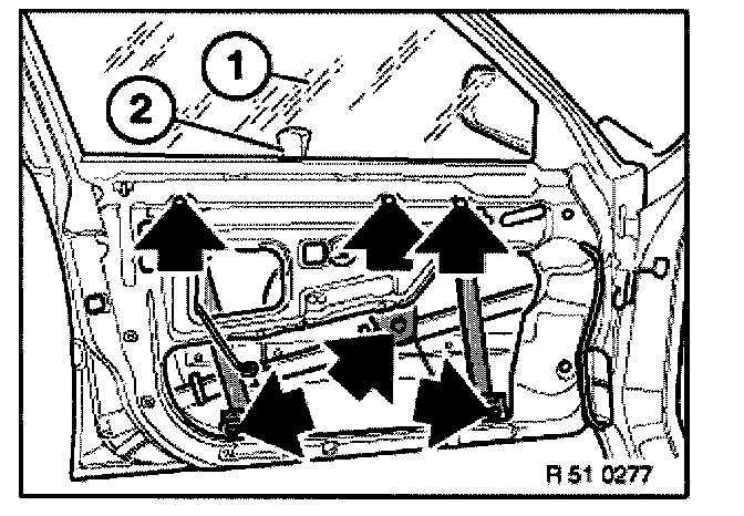 - Unfasten screws (only loosen lower 3 screws) and remove complete cable on window regulator.