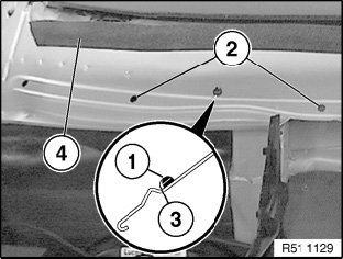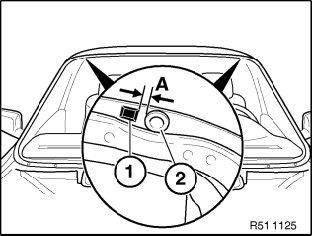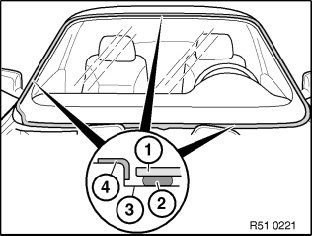 When installing windshield (4), check that it is lower with respect to roof outer skin panel (1). This is the only way of ensuring sufficient pretension between the sealing lip (2) and the roof (prevention of wind noise). Check installation position of windshield (4) in middle of vehicle with special tool 51 3 210; a clearance (A) is permitted.