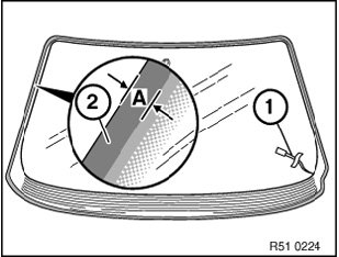 Treat windshield in glued area (A) with materials approved by BMW (repair kit, sourcing reference: BMW Parts Service).