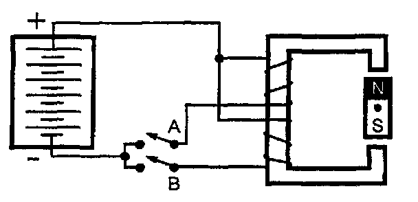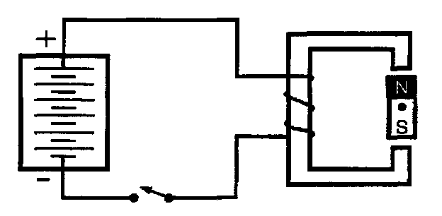 When the switch is closed, current flows through the wire creating a magnetic field. With the wire wrapped around the soft iron in the direction shown here, the magnetic field North pole will be located at the top.