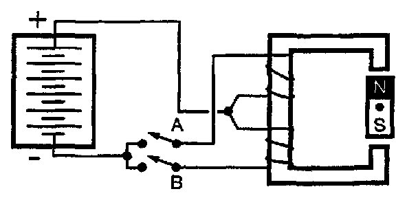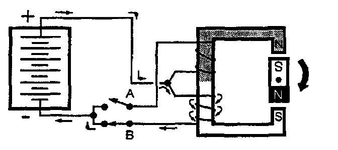 Momentarily closing switch "A" energizes the top coil, a magnetic field forms with its North pole at the bottom, and the rotor turns 180 degrees again to align with the new field.