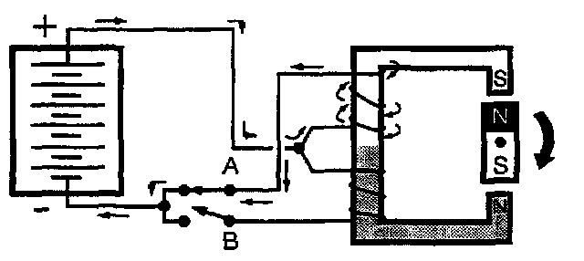 Alternately closing switches "A" and "B" toggles the magnetic field polarity, causing the rotor to rotate in 180 degree steps