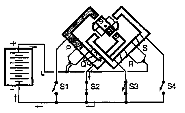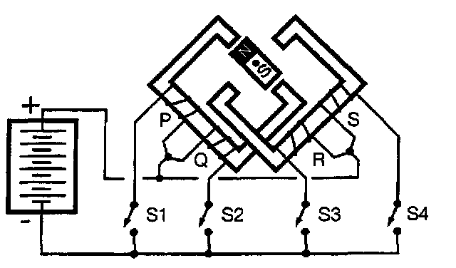 To move the rotor another 90 degrees, energize coil "Q" (by closing switch "S2").