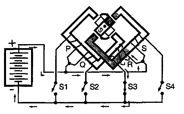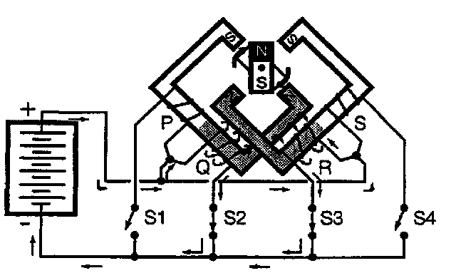 Current flows through coil "Q" in such a way as to create a magnetic field having its North pole at the top and the rotor turns clockwise 90 degrees to align with the field.