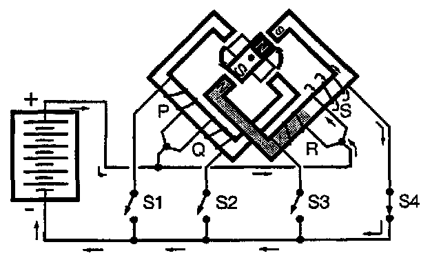 To keep the components straight we should label the coils ("P," "Q," "R, " and "S") and the switches ("S1," "S2, "S3", and "S4").