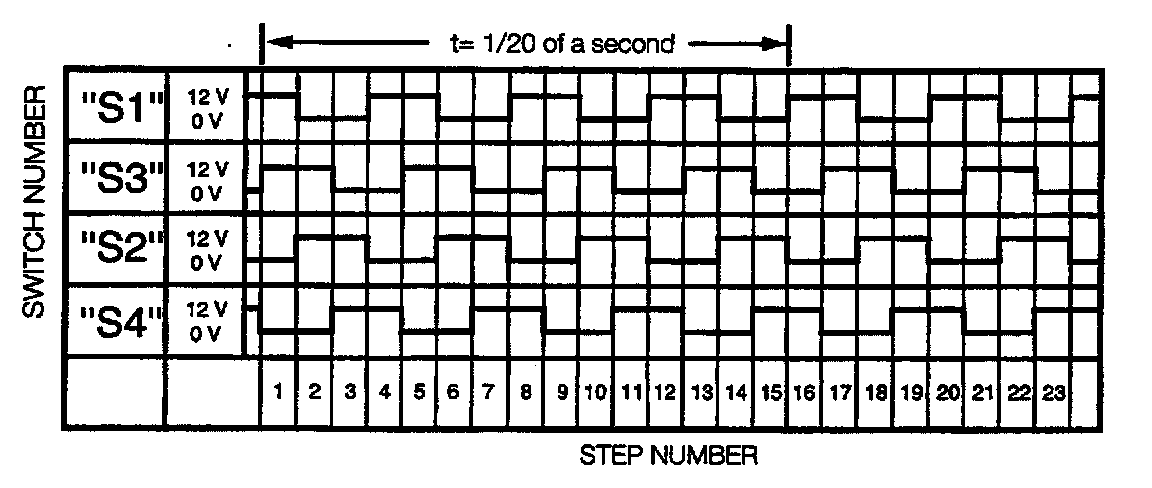Because so many separate motor coil activations are required to cause perceptible output shaft movement, the climate control system control module is programmed to open and close the right switch(es), in the correct sequence, very quickly. (The average time for a flap to go from fully closed to fully opened is about 12 seconds. That translates to about 3600 pulses in 12 seconds, or 300 pulses per second.) The drawing below shows an actual sequence of switch openings and closings for a stepper motor to partially open a flap.