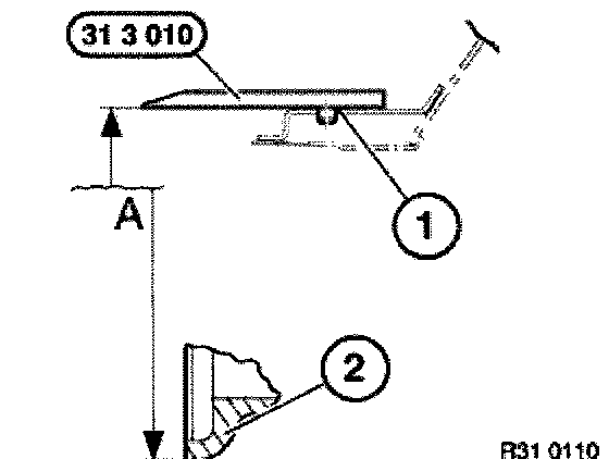 Open hood. Insert special tool 31 3 010 in left and right sides of bore (1) in wheel arch.