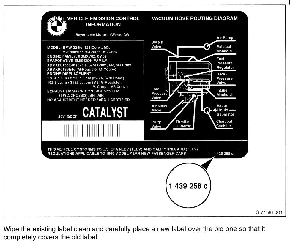 If requested by a customer, or on any new cars in stock, the repair consists of checking the Vehicle Emission Control Information label on the underside of the hood to see if the correct label is in place, and installing the correct one if necessary. Each owner of an affected car will receive a notification letter (sample attached) and a replacement label. The owner can either install the new label, or request that it be installed at your BMW center.
