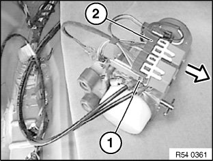 NOTE: There are 2 different hydraulic units. The unit illustrated is the newer one. It was introduced at the beginning of 1999. In the event of replacement, this new unit can be installed.
